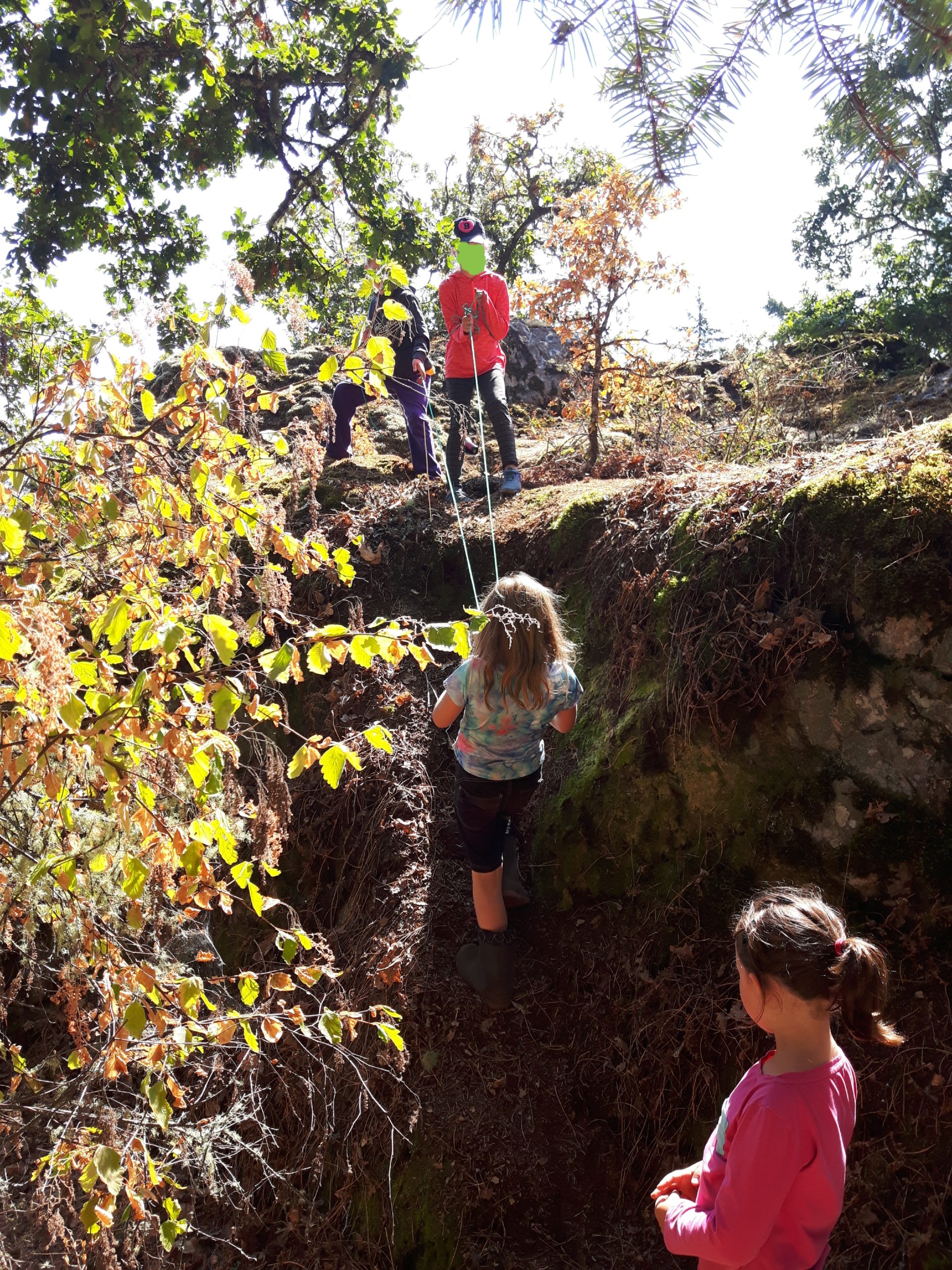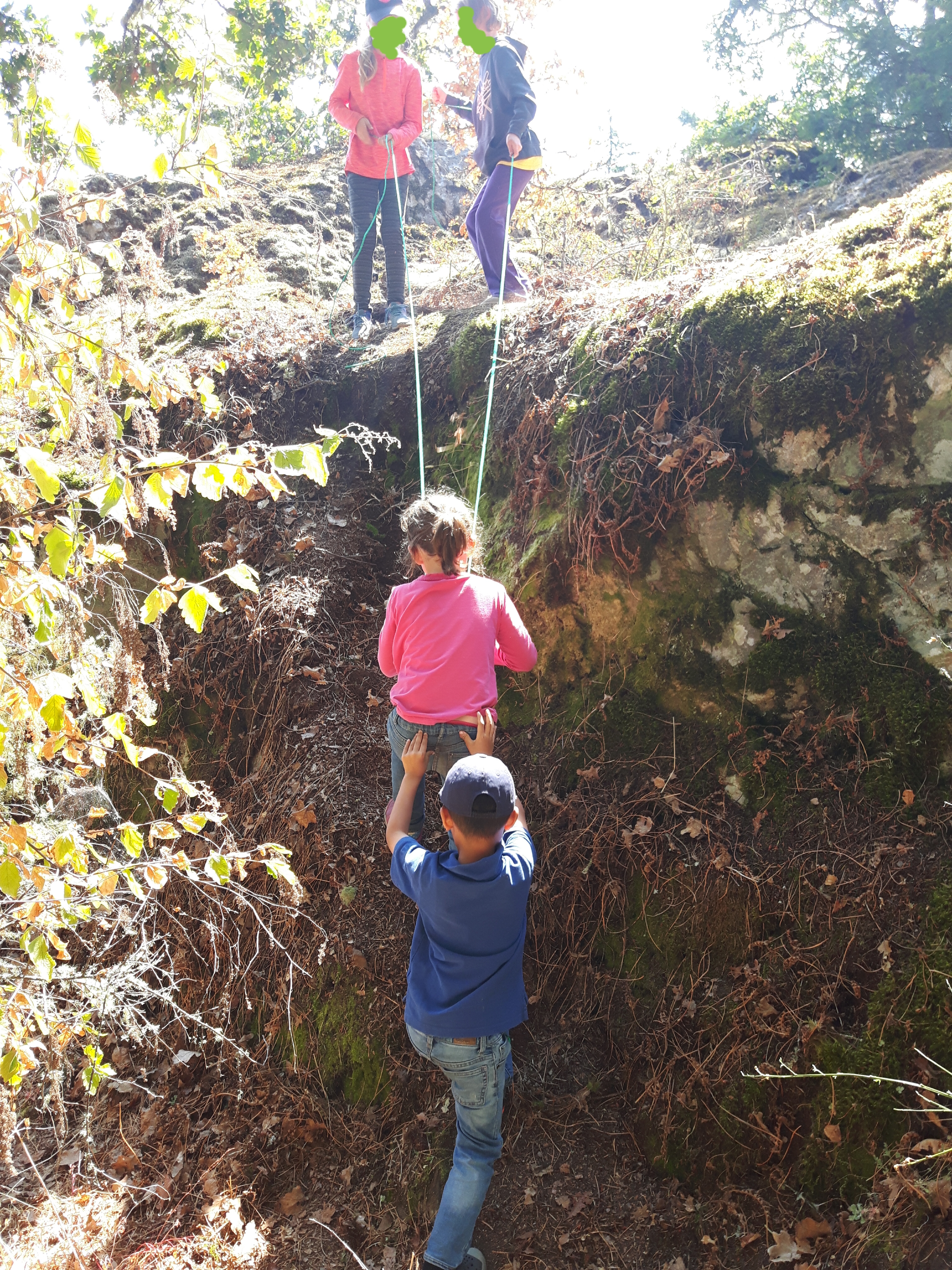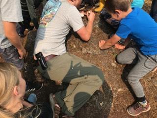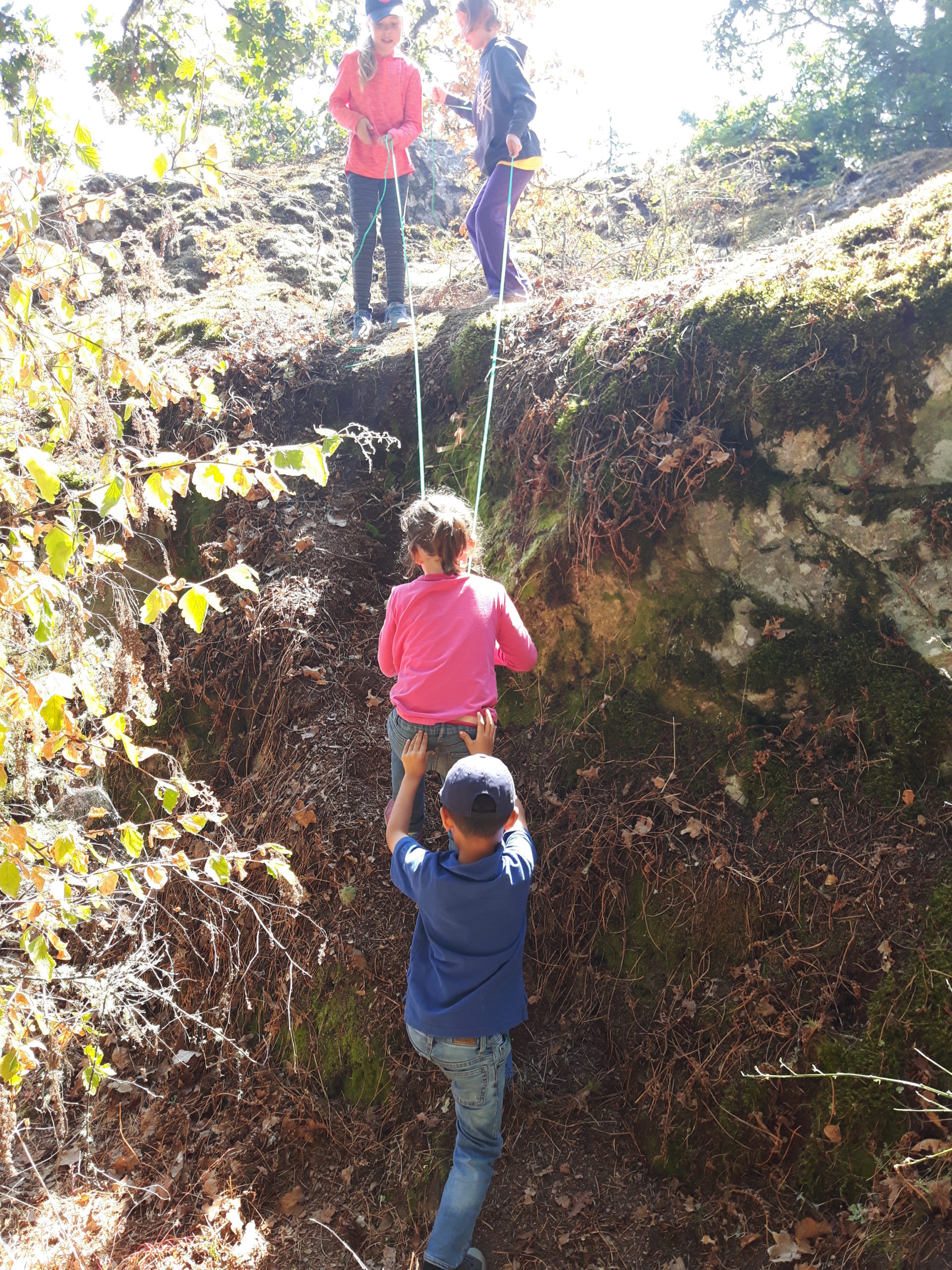 I was sitting with a few kids whittling when one of the girls came up to me and said “Can we have some green rope?” Intrigued, I wandered down the hill to see what they were up to. Turns out, one kid had whittled a handle and they had attached it to a length of twine to use as a belaying rope. The twine wasn’t strong enough, so they needed green rope. Of course they did! It was truly a beautiful example of problem solving, collaboration and trust, watching them figure out how to use the rope to help each other up the rock face. A harness and a harness holder was added, then a spotter and a safe route was chosen (mindfully, in order to avoid pulling down the moss from the rocks), and soon enough the whole group was waiting in line for their chance to belay up and down the rock face. Amazing!
