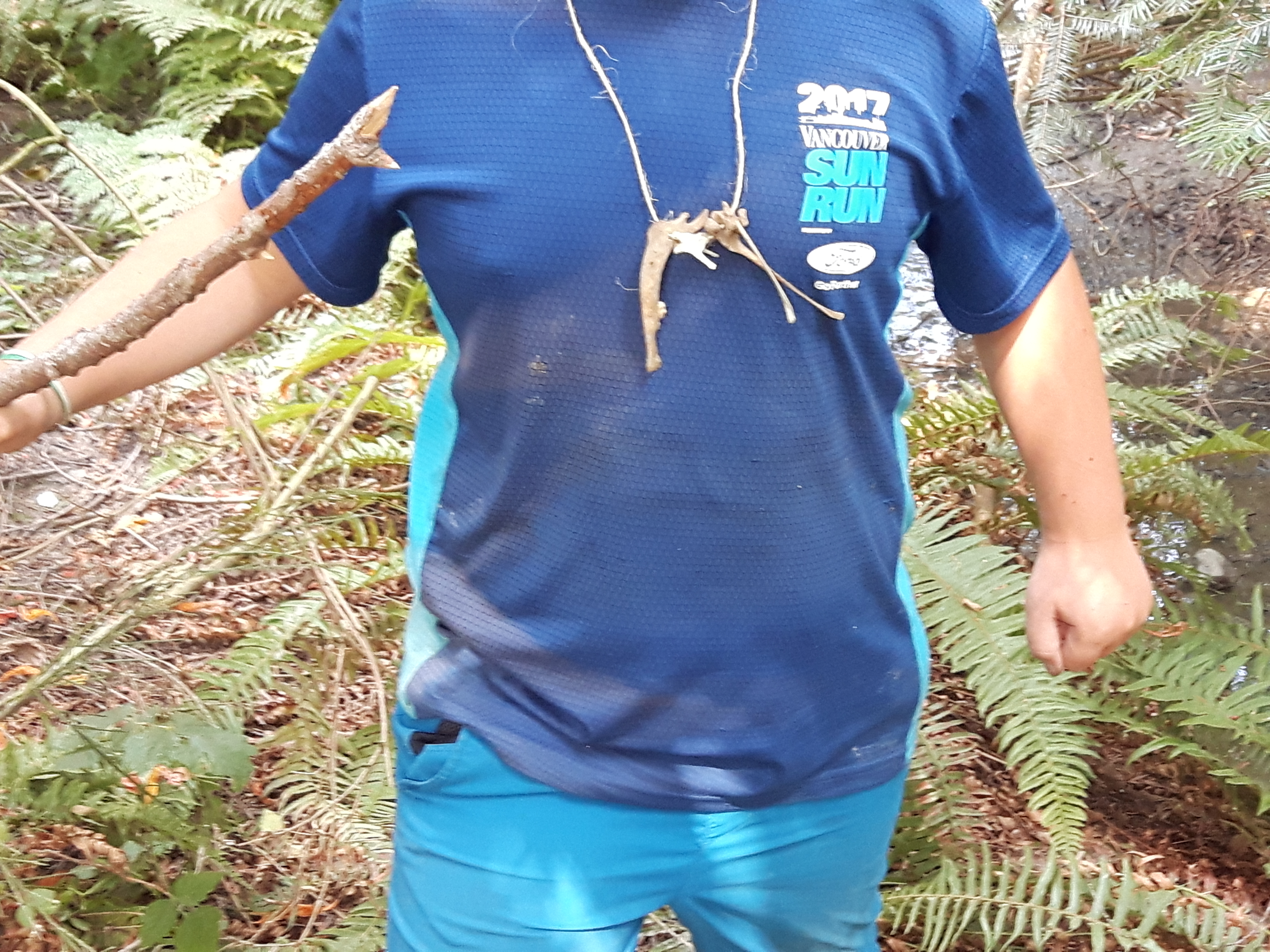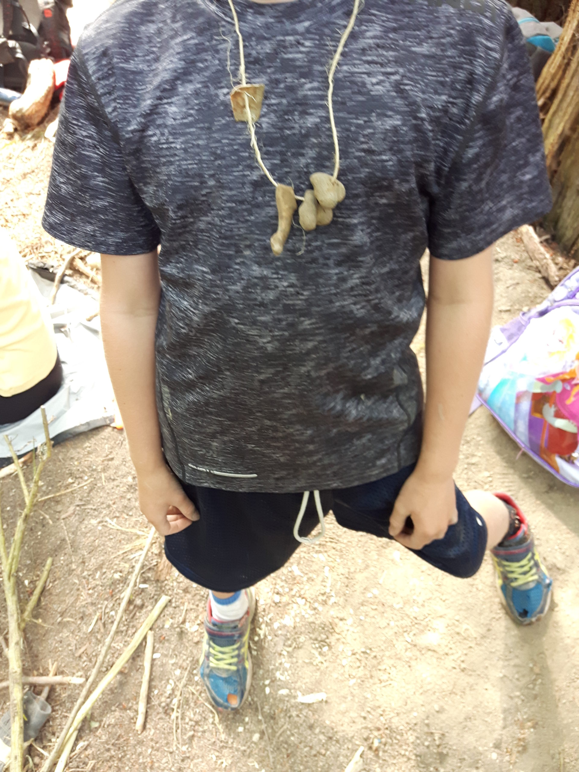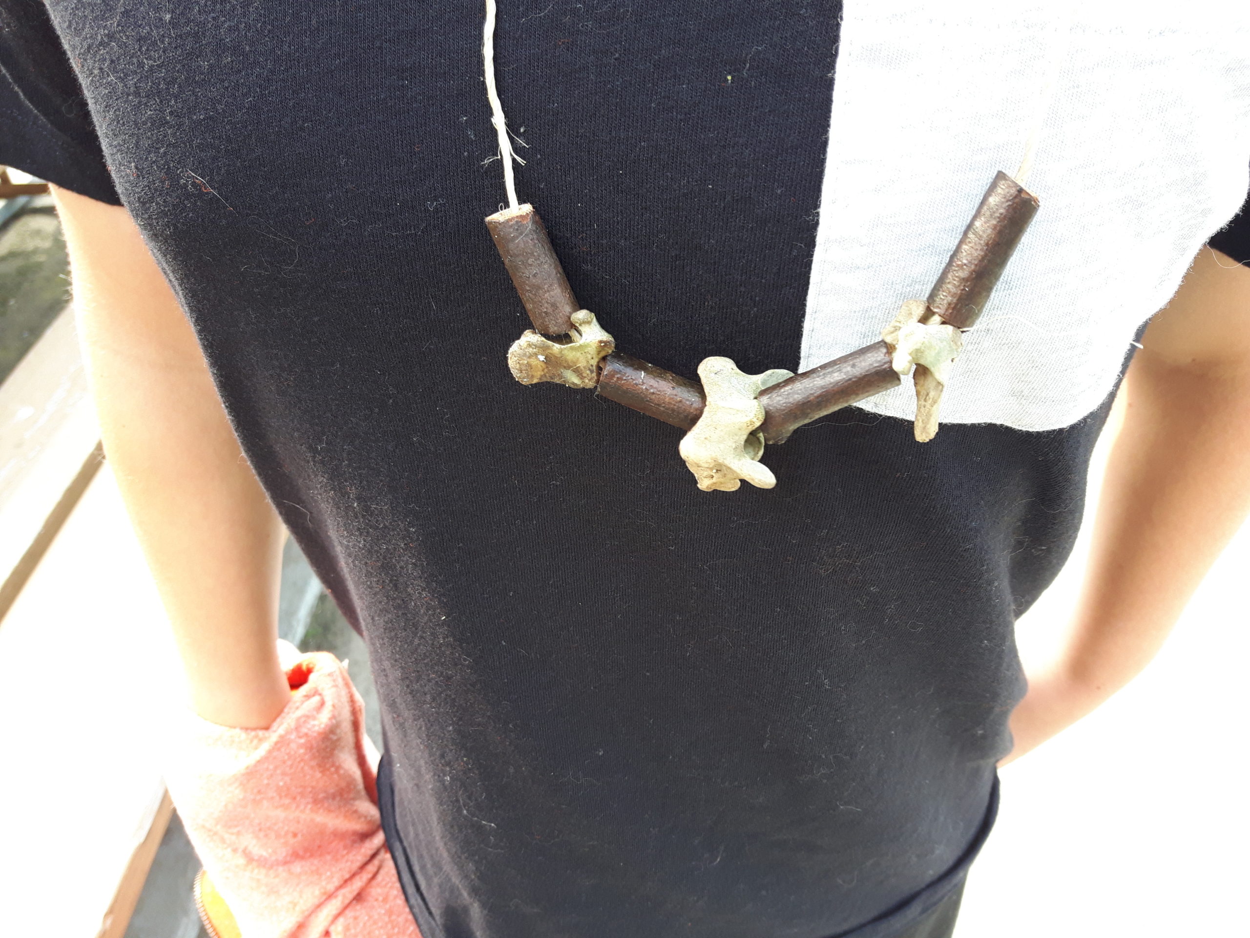 Finally during the last week, someone found an old bone in a place we had been sitting in every day, for many days, then another, and another, until we had a whole Ziploc bag full of bones (raccoon maybe?). What do you do with a bag of bones? Make necklaces out of them, obviously. Their idea, not mine.